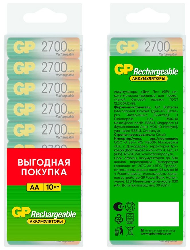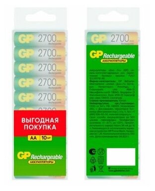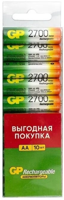 Аккумулятор GP Ni-Mh 2700 мА·ч 1.2 В Rechargeable 2700 Series AA, в упаковке: 10 шт.