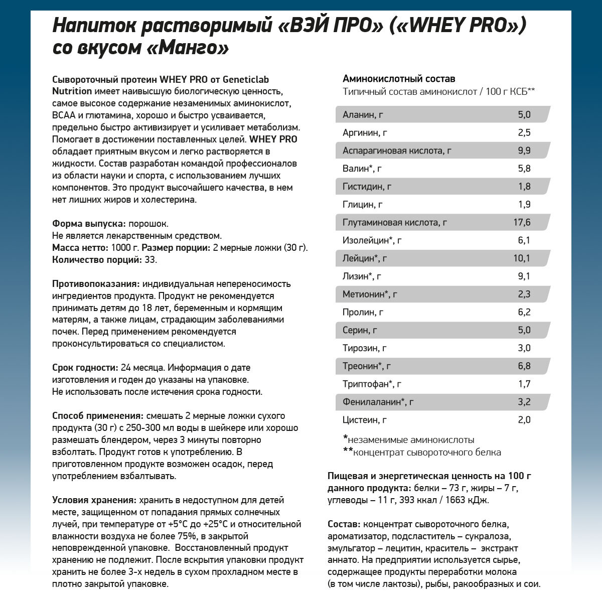 Сывороточный протеин GeneticLab Nutrition, Whey Pro, 2100 грамм, Россия, Манго