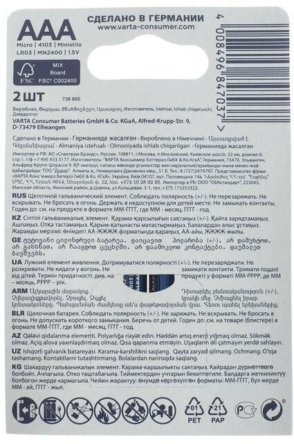 Варта / Varta - Батарейки Longlife Power Alkaline High Energy micro AAA LR03 1,5V 2 шт