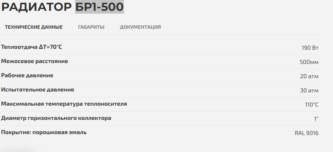 Радиатор биметалл Теплоприбор (россия) BR1-500х5 секций, 9.50 м2, теплоотдача -950 Вт, боков.подключение