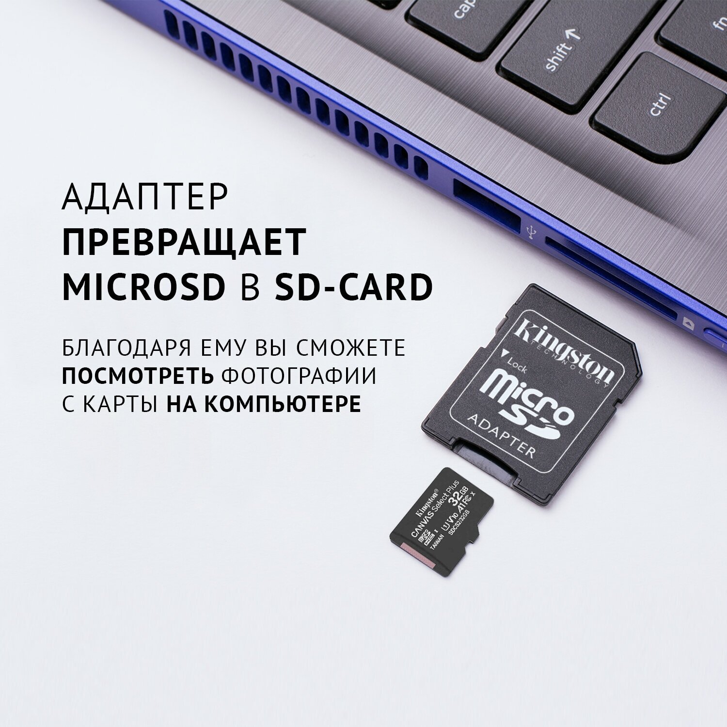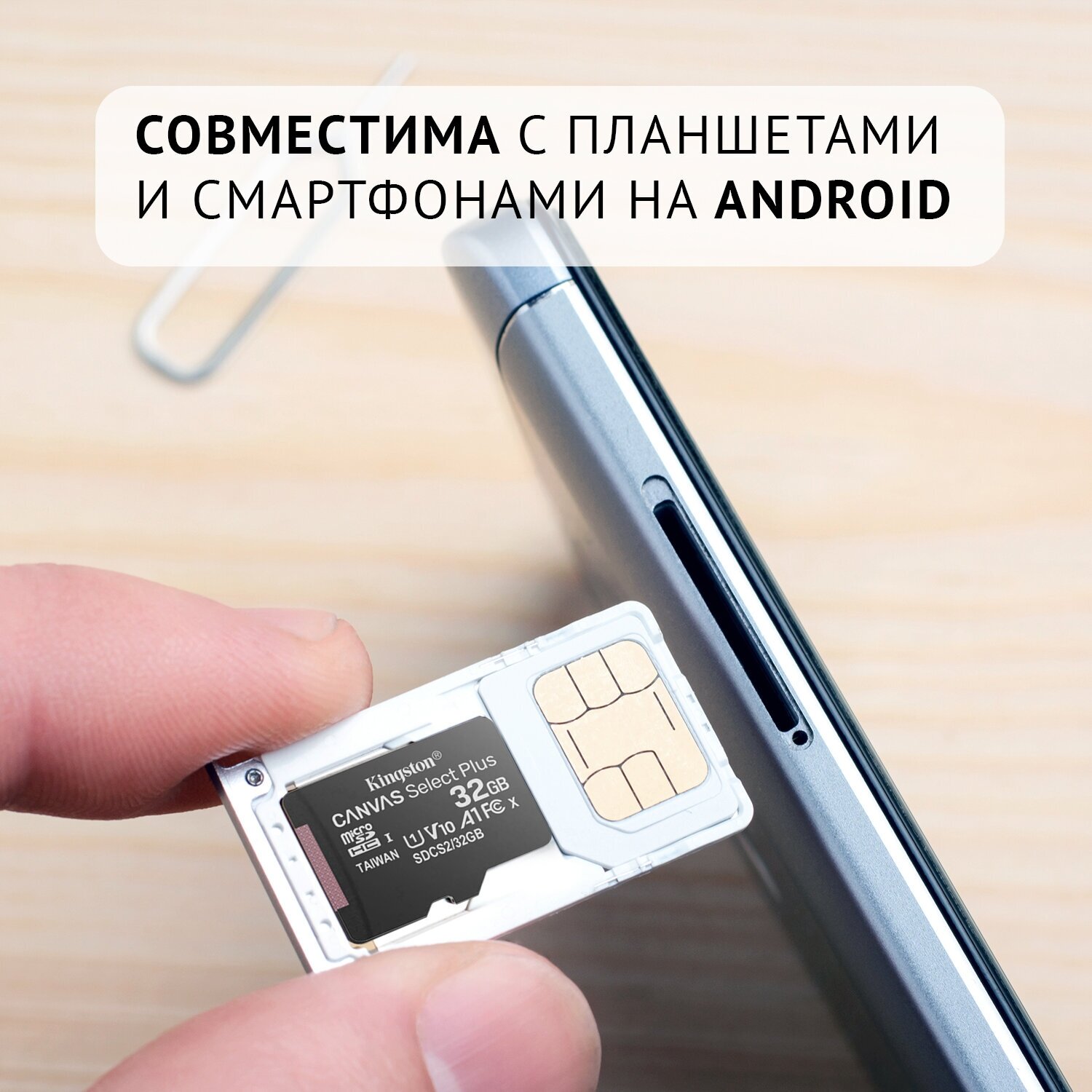 Карта памяти Kingston Canvas Select Plus microSDHC 32 ГБ Class 10, V10, A1, UHS-I U1, R 100 МБ/с, адаптер на SD, 1 шт., черный
