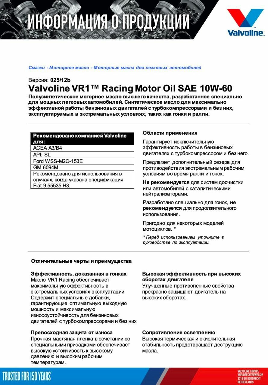 Valvoline Масло Мотор. Valvoline Vr1 Racing 10w-60 5л.