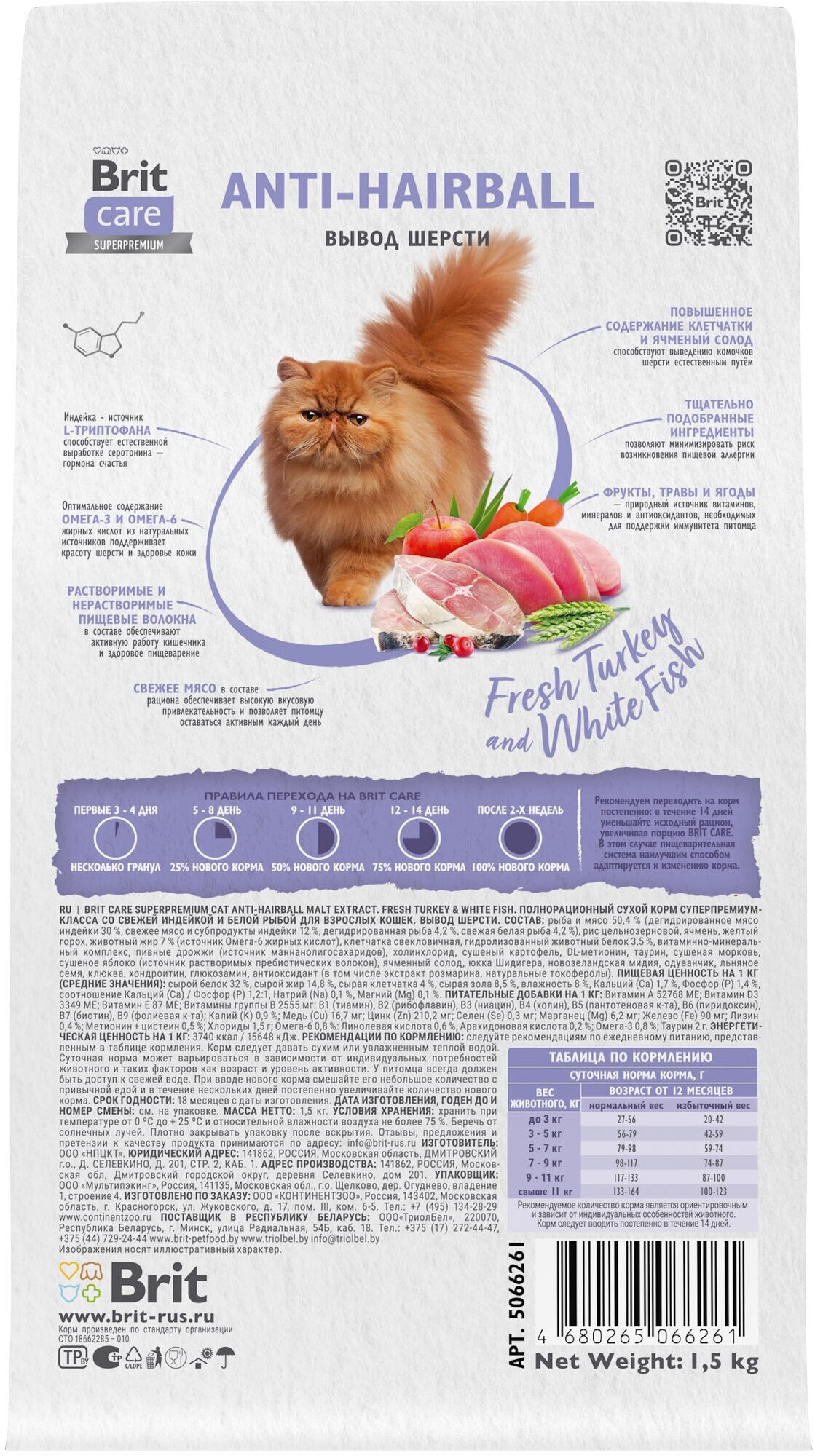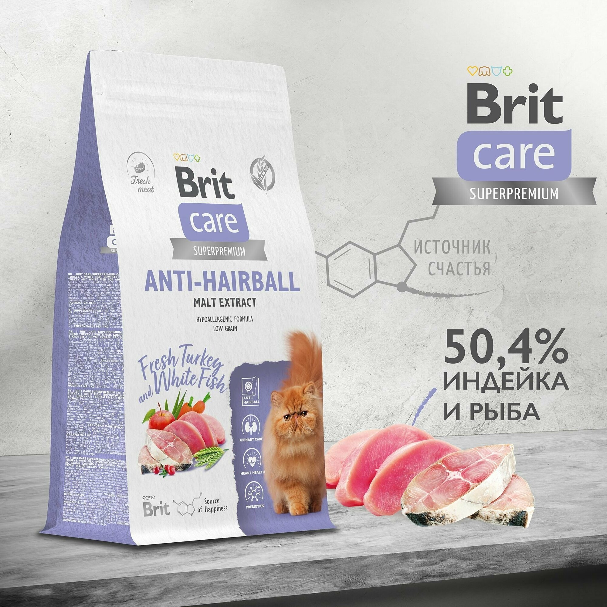 Brit Care Сухой корм Care Cat Anti-Hairball с белой рыбой и индейкой для взрослых кошек 5066261 1,500 кг 63356 (1 шт)