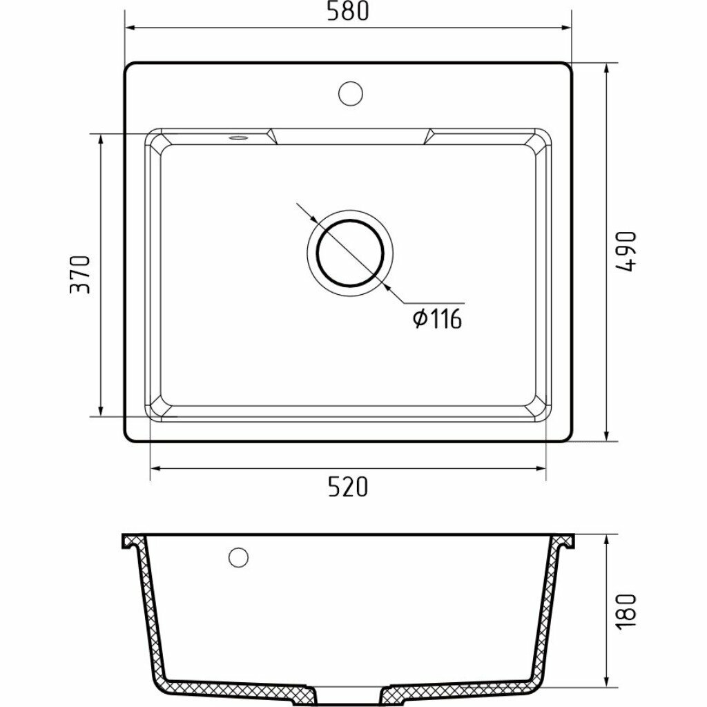 Мойка кухонная врезная, GranFest, Urban, кварцевый песок, 580х490 мм, одна чаша, черная, GF-UR-658
