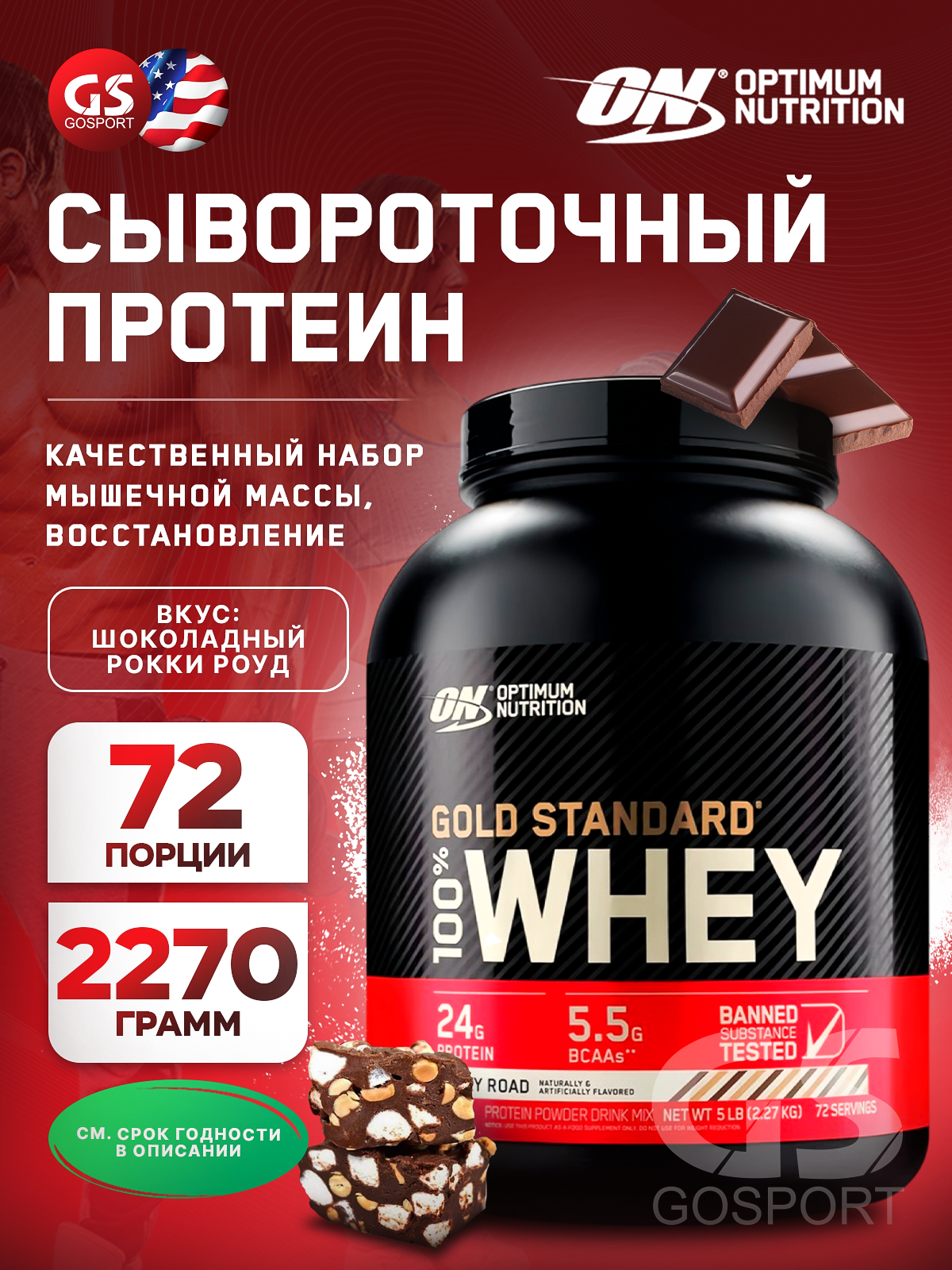Протеин сывороточный для набора мышечной массы Optimum Nutrition 100% Whey Gold Standard, вкус: печенье роки роад