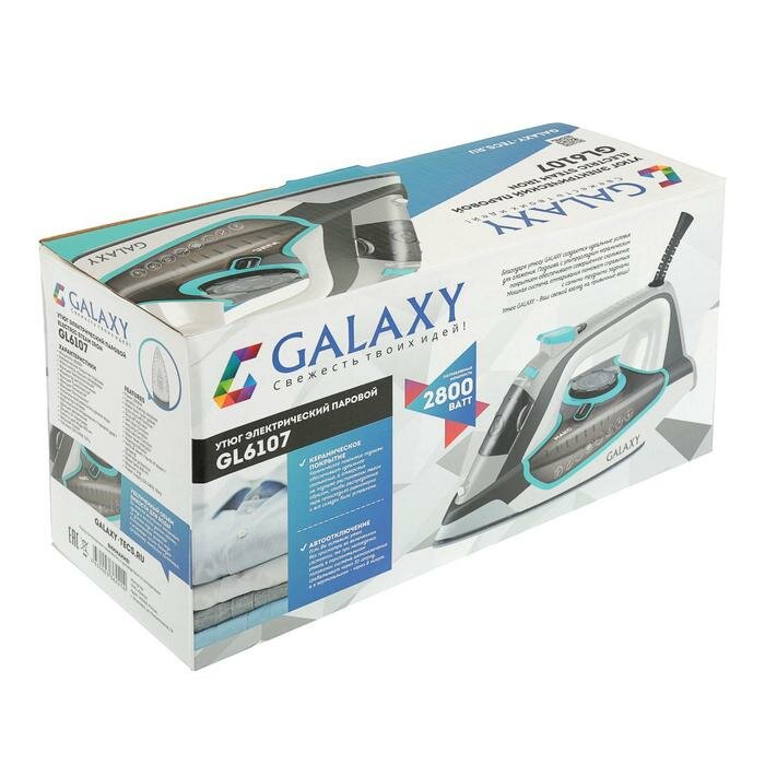 GALAXY GL 6107 Утюг 2800 Вт, керамическое покрытие подошвы, уплотнитель крышки резервуара, функции: «автоотключение», «самоочистка», «антикапля», «антинакипь», индикатор автоотключения, указатель максимального уровня воды, индикатор нагрева, вертикальное