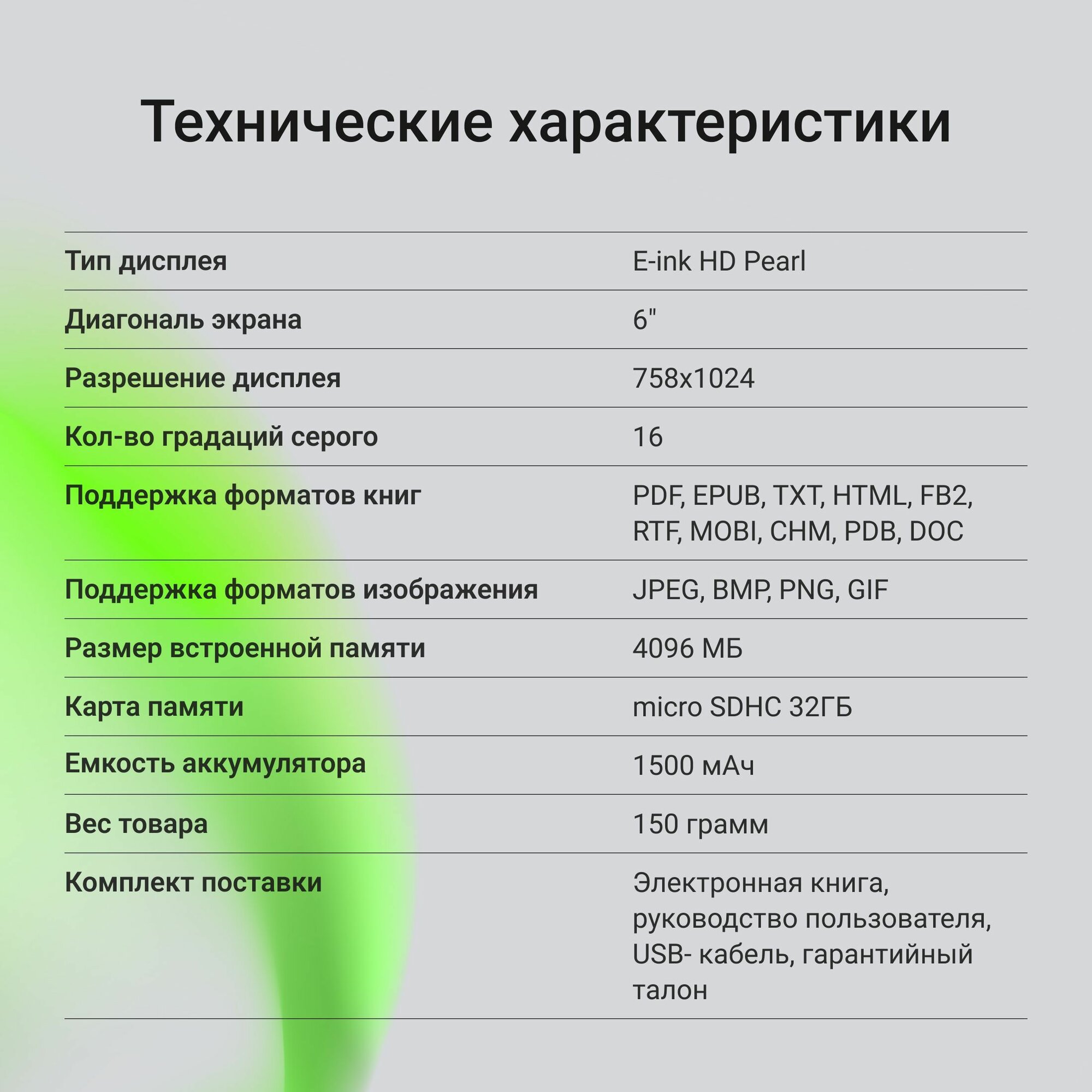 - 6 " / 800x600 пикс / бумагоподобный (E Ink) / монохромный / 16 градаций серого / / сенсорный дисплей / подсветка