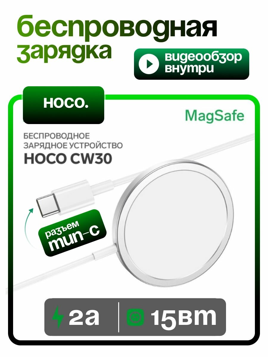 Беспроводная магнитная зарядка HOCO CW30 Pro New Upgrade с поддержкой Magsafe, Кабель Type-C 1 метр, Мощность 15W, Белый