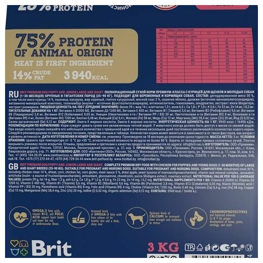 BRIT PREMIUM DOG PUPPY & JUNIOR LARGE & GIANT для щенков и молодых собак крупных и гигантских пород с курицей (3 кг х 3 шт)