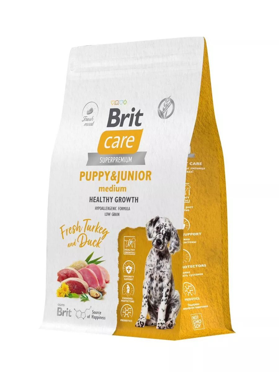 Сухой корм для щенков средних пород супер-премиум с индейкой и уткой "Dog Puppy&Junior M Healthy Growth" 1,5 кг BRIT CARE