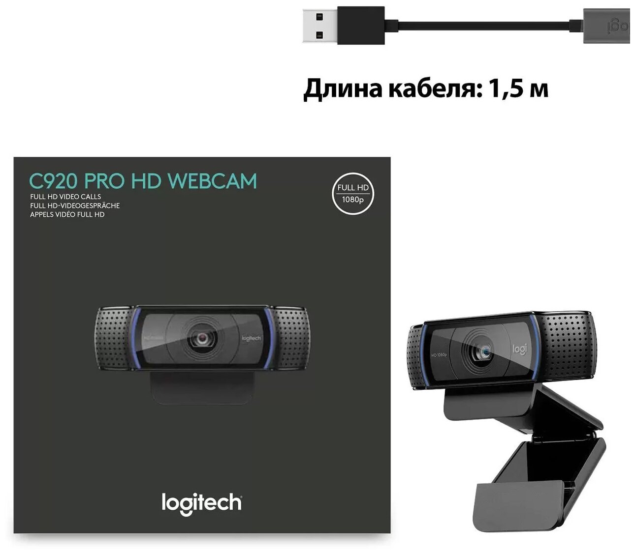 Веб-камера Logitech HD Pro Webcam C920 черный, разрешение Full HD 1920х1080