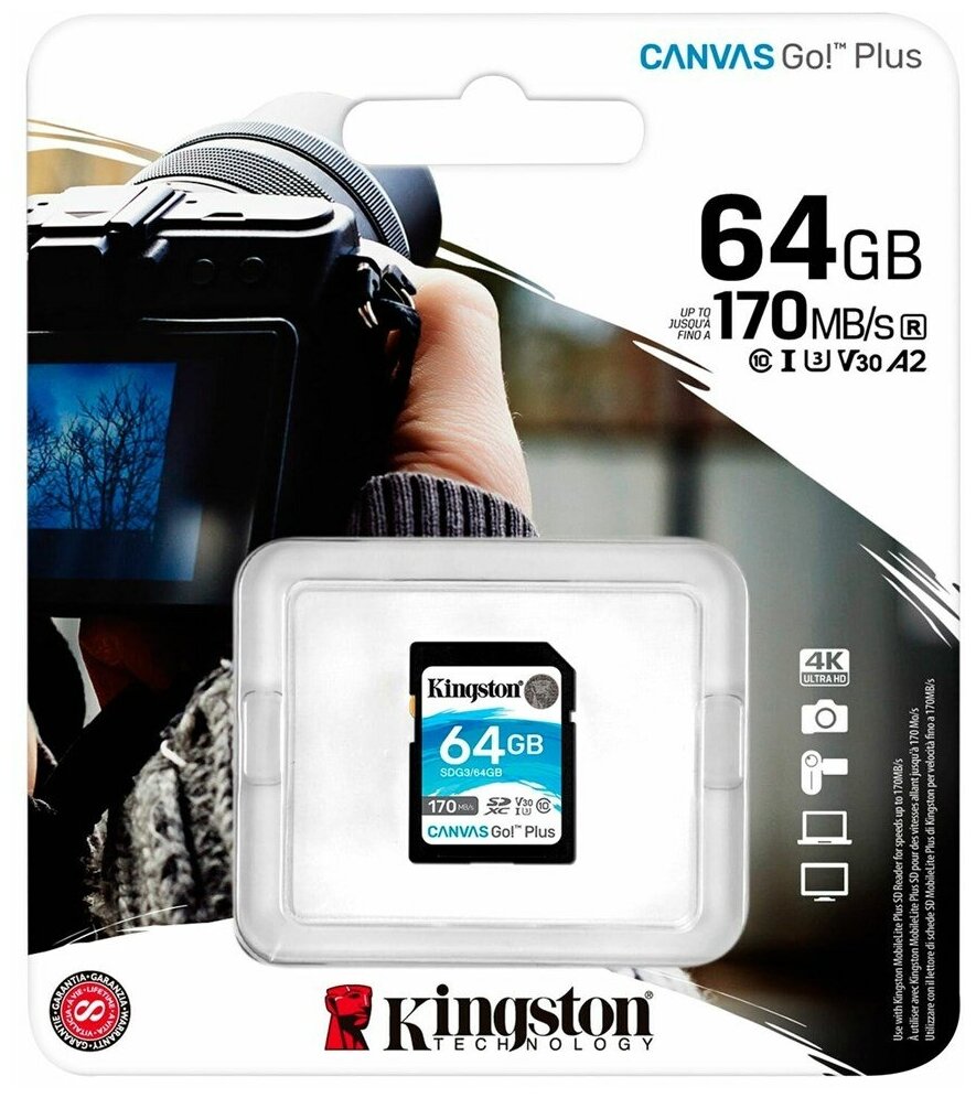 Карта памяти Kingston Canvas Go Plus, SDXC, 64 гб, UHS-I U3, 170 Мб/с, класс 10 (SDG3/64GB)