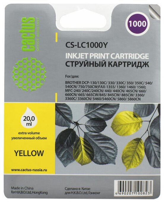 Картридж Cactus CS-LC1000Y совместимый струйный картридж (Brother LC-1000Y) 20 мл, желтый