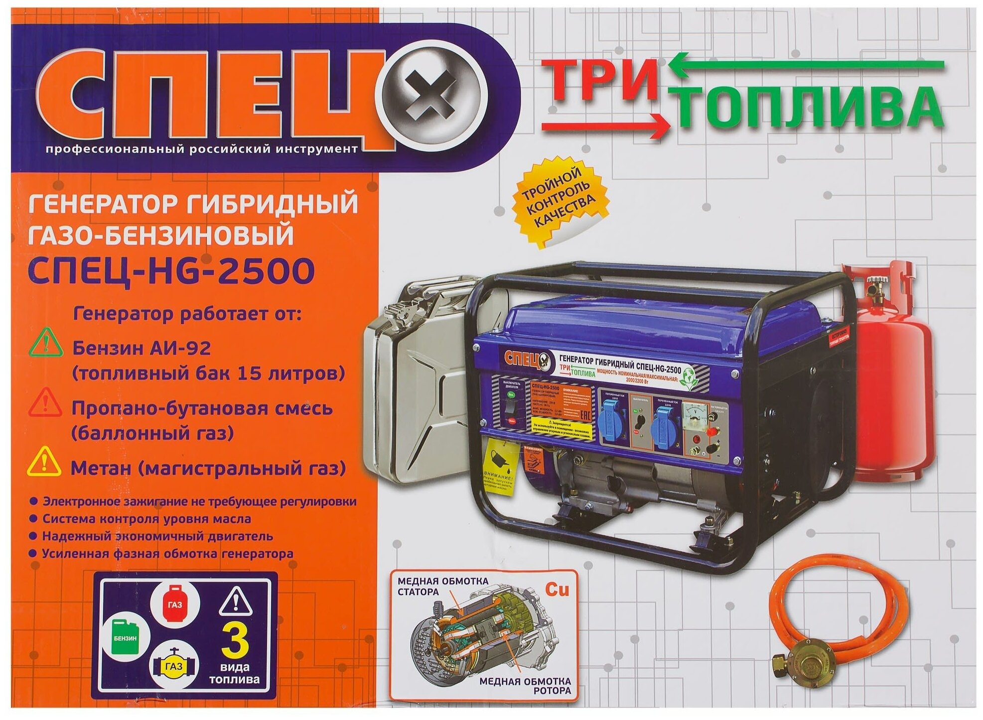 Цена для г. Сысерть. Генератор гибридный газ/бензин «Спец» используется для подключения строительных и бытовых электроприборов при отсутствии стационарной электрической сети, в полевых условиях или чрезвычайных ситуациях. Экономичный генератор рассчитан на подключаемую нагрузку мощностью не более 2,2 кВт. Устройство работает на трех различных видах топлива: бензине, баллонном и магистральном газе. Магазины в городе Сысерть смотрите ниже
