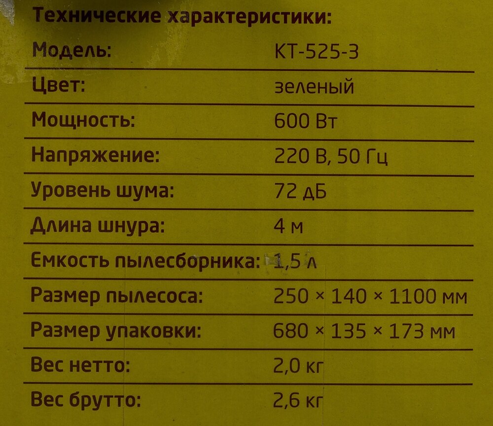 Пылесос КТ-525-3, вертикальный, 600 Вт, 1.5 л, шнур 4 м, зеленый