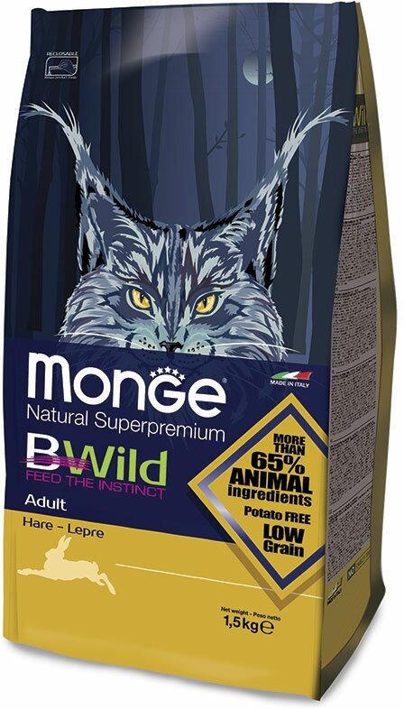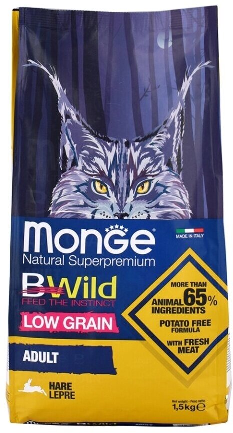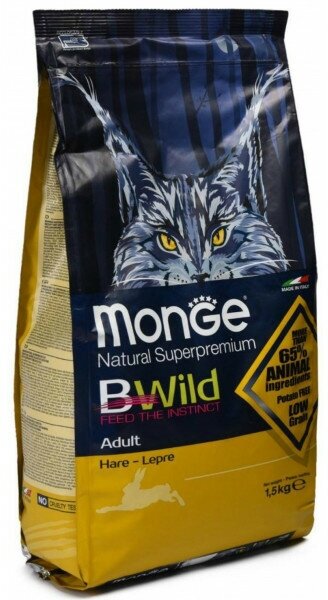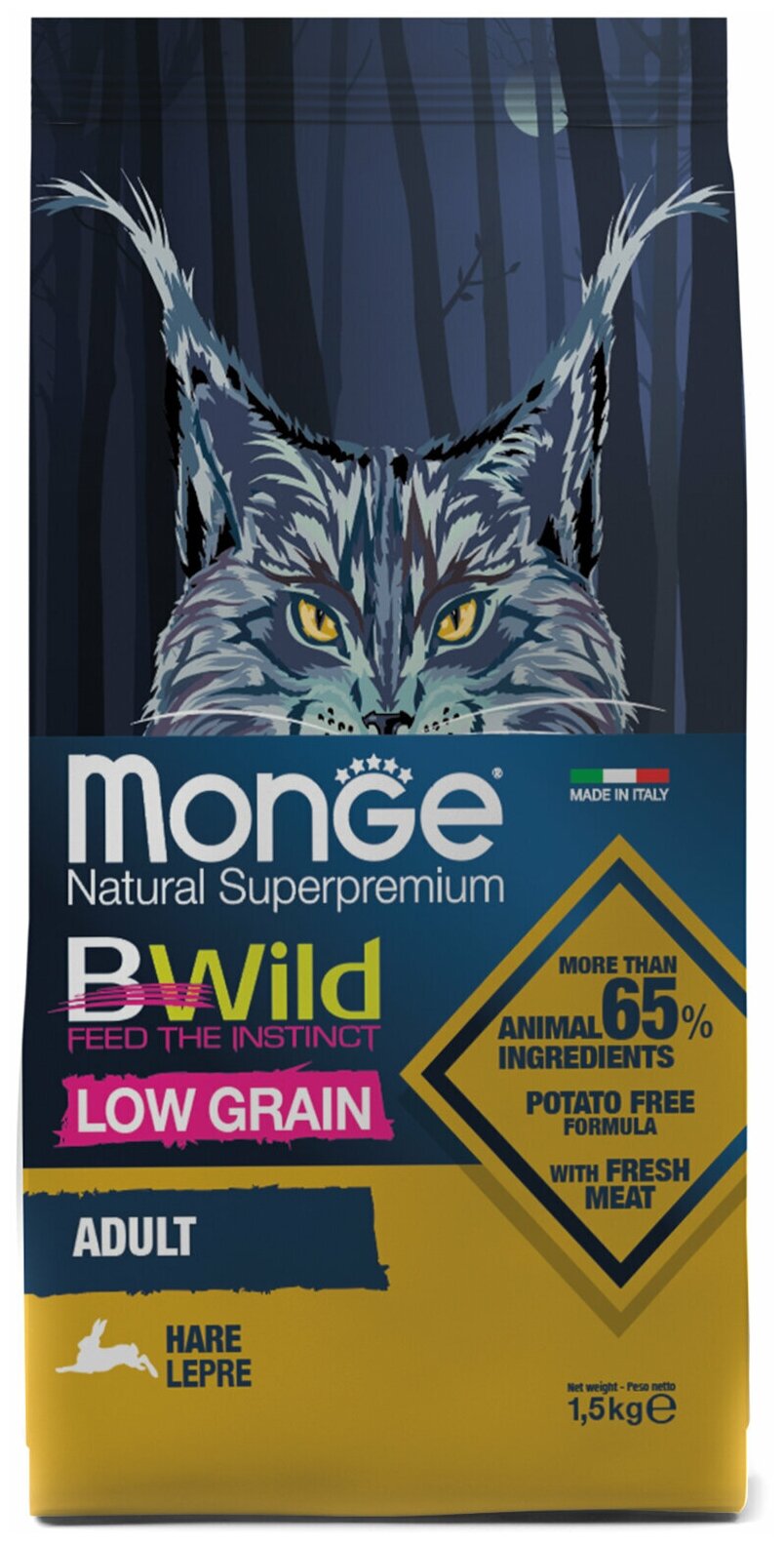 Корм сухой Monge BWild Cat Hare для взрослых кошек, низкозерновой, мясо зайца, 1,5 кг