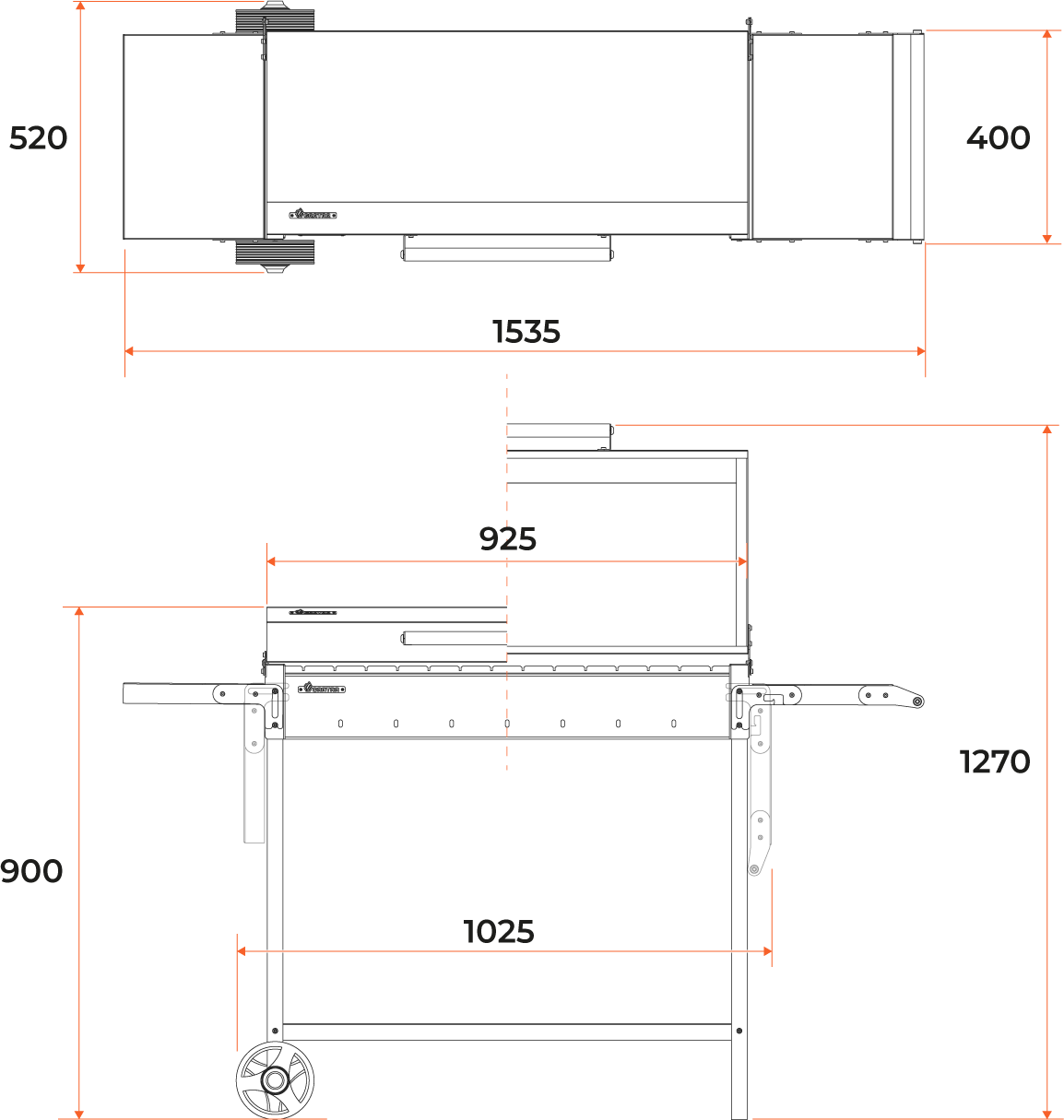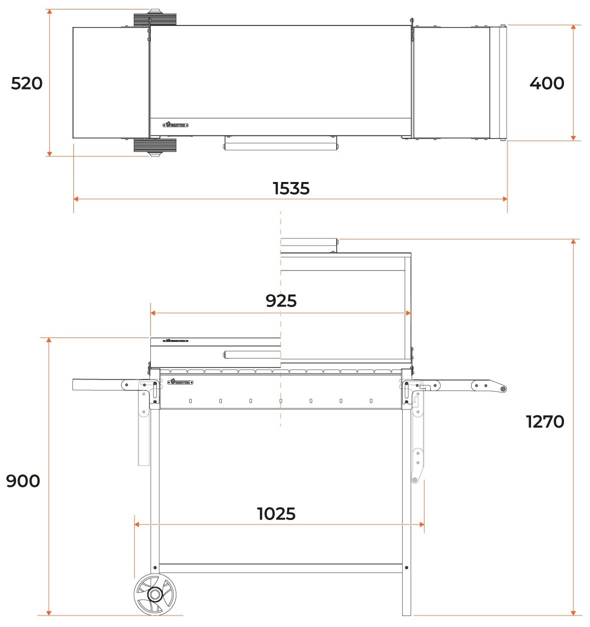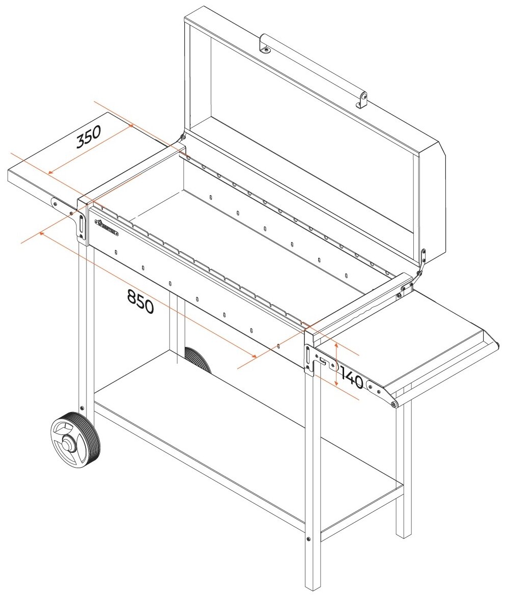 - встроенный термометр, верхняя решетка (для овощей), автоподжиг, колеса для транспортировки, место для дров / баллона, крышка (закрывающийся)