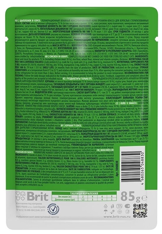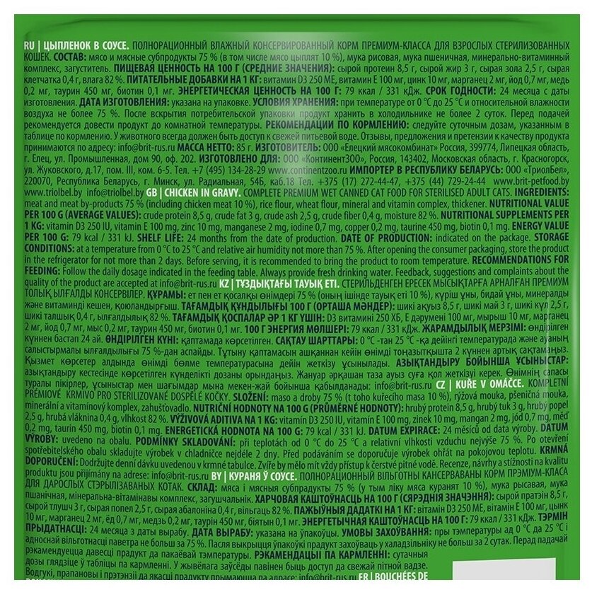 BRIT PREMIUM CAT CHICKEN SLICES FOR STERILISED д кастрир и стер кош с курицей в соусе пауч 85 гр 85 гр х 4 шт