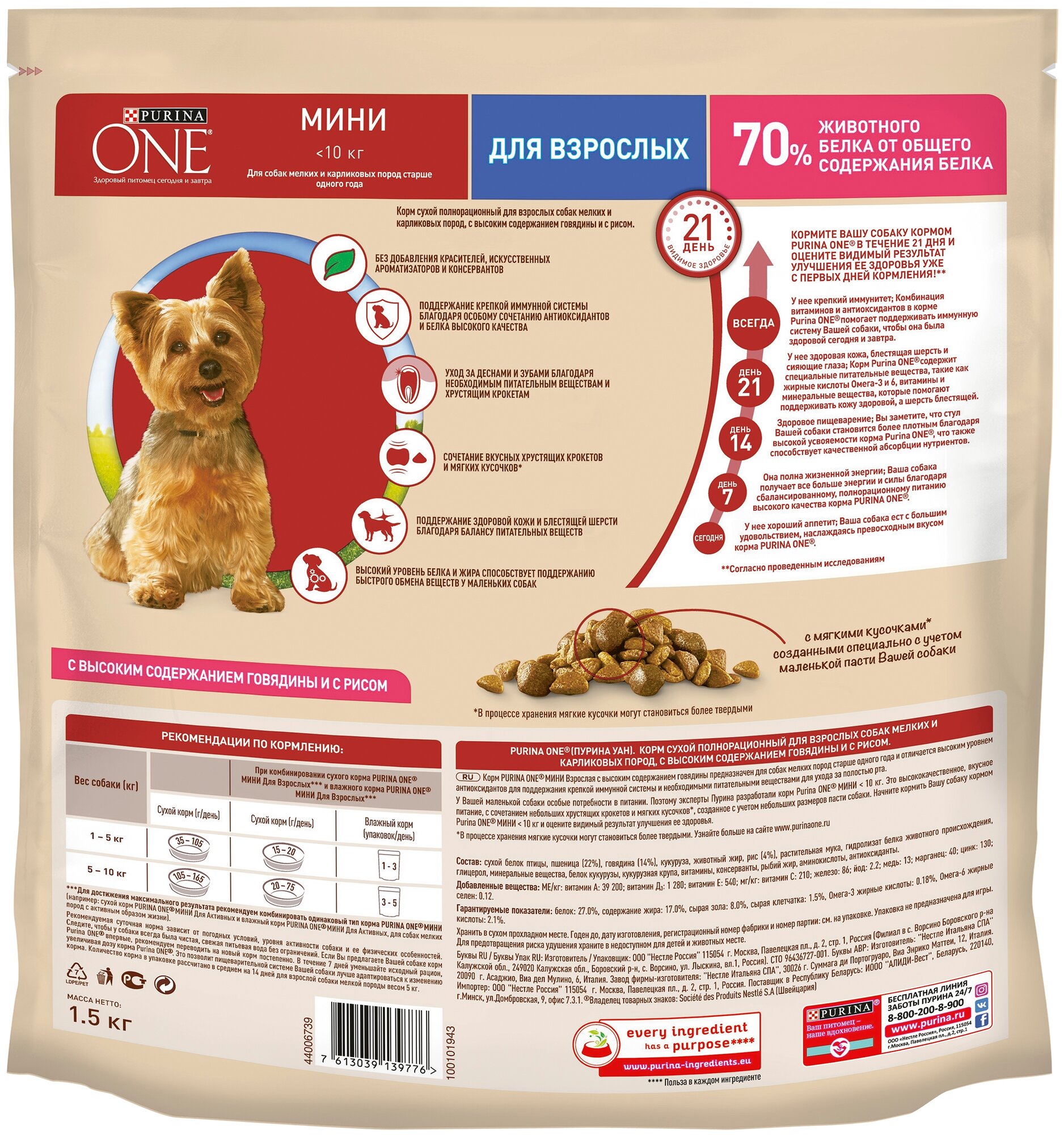 Сухой корм Purina ONE мини <10 кг для взрослых собак мелких и карликовых пород, с говядиной и с рисом, 1,5 кг