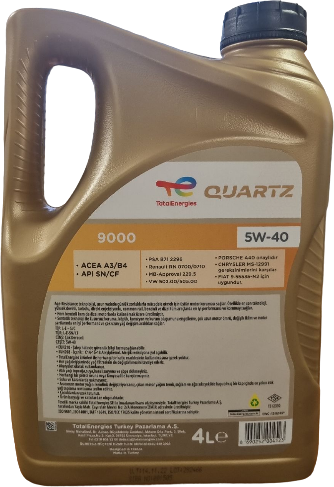 TOTALENERGIES 213674 TOTAL 5W40 4L масло моторное QUARTZ 9000 ACEA: A3/B4 API SM/CF PSA B71 22