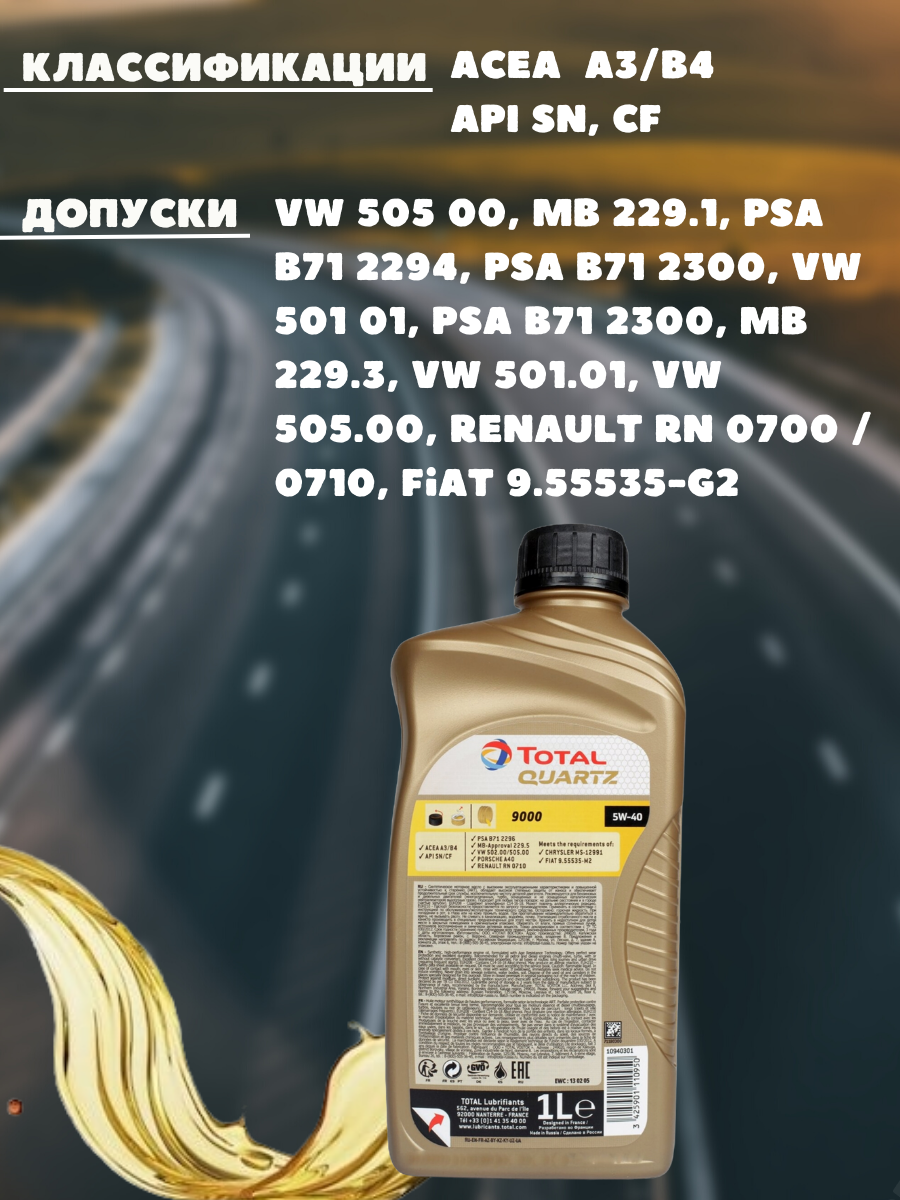 TOTALENERGIES 10210301 Масло моторное синтетическое 1л - QUARTZ 9000 5W40 A3/B4, SM/CF, PSA: B71 2296, VW: 502.00/505.00, BMW: LL-01, MB: 229.3, PORSCHE A40 (пр-во ) 1шт