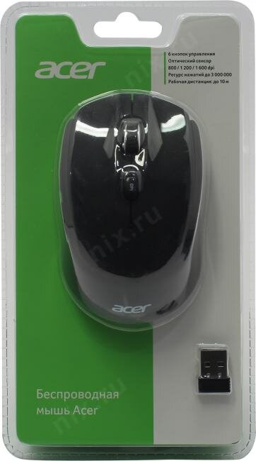 Мышь Acer OMR040 черная, оптическая (1600dpi), беспроводная, USB (6 кнопок)