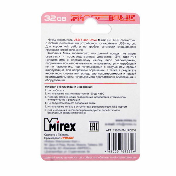 Флешка Mirex Elf Red 32 Гб usb 2.0 Flash Drive - красный
