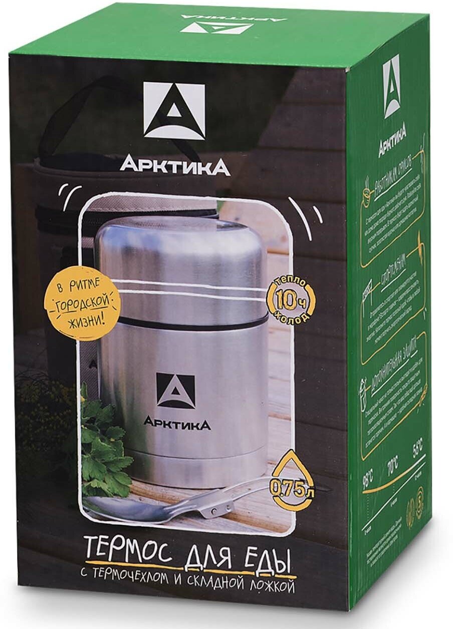 Термос для еды и супа Арктика 301-750А серебристый 0,75 литров со складной ложкой и чехлом в комплекте