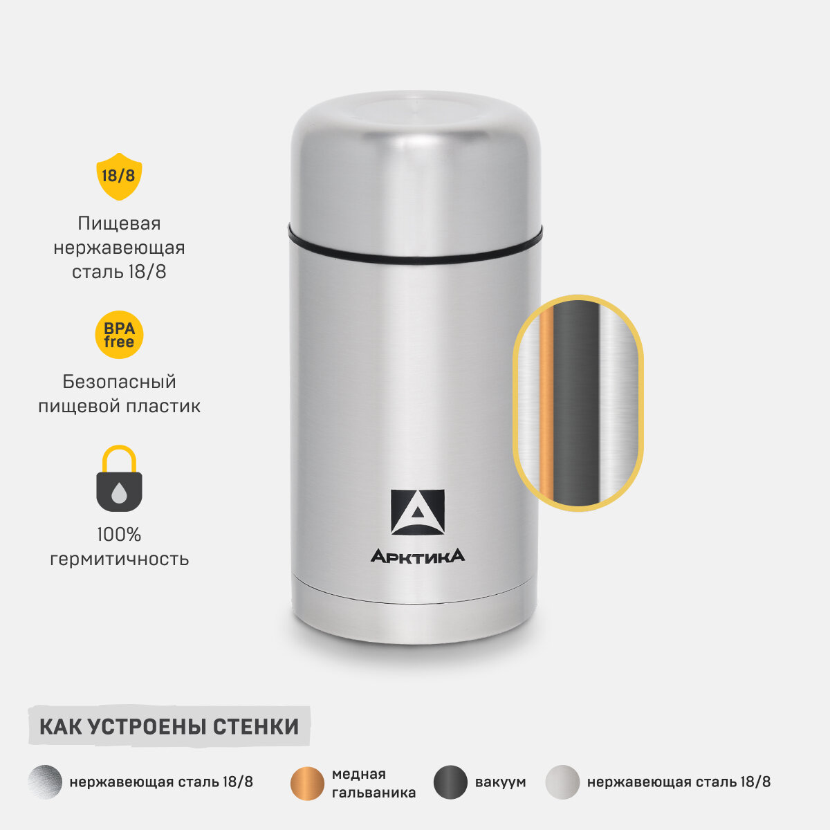 Термос для еды Арктика 301-А, 1 л, серебристый